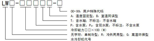 型號(hào)舉例:LW-15P:水冷卻機(jī),制冷量為1500W,自帶循環(huán)水泵,不帶水箱。
