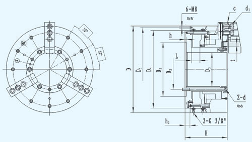 ☆前置式氣動(dòng)夾緊,卡盤內(nèi)藏氣缸,機(jī)床前后可各配一臺(tái)卡盤。