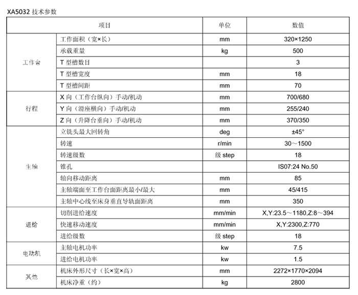 XA5032型立式升降臺(tái)銑床是改進(jìn)型通用產(chǎn)品。該產(chǎn)品操作方便,性能可靠,廣泛適用于各類機(jī)械加工部門,加工各種平面、溝槽、齒輪等配置萬能銑頭、圓工作臺(tái)、分度頭等銑床附件,可進(jìn)一步擴(kuò)大機(jī)床使用范圍